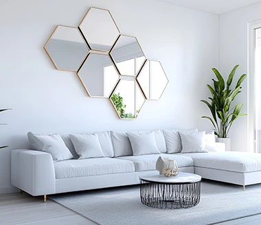Strategically placed mirrors bounce light around, while curated artwork serves as a compelling conversation starter.
